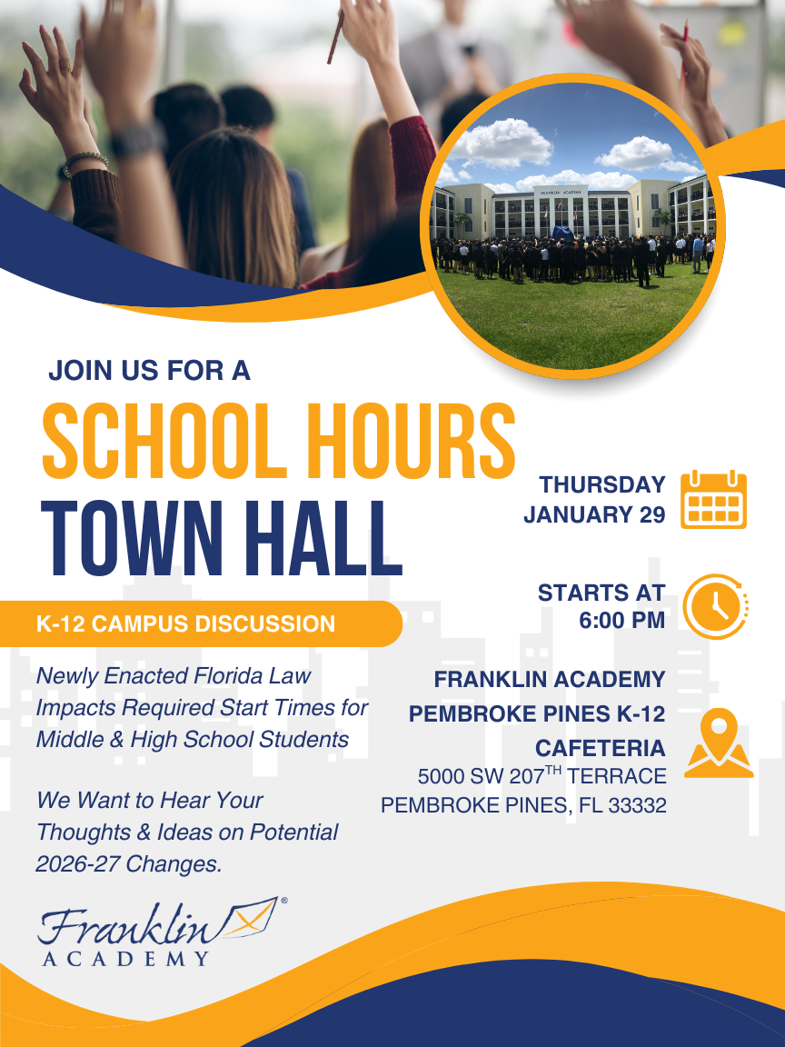 Franklin Academy is proud to offer the residents of Broward County a K-12 system. Our newest campus will serve students in grades K-12. Our spacious 40 acre campus is located near 5000 SW 207th Terrace, Pembroke Pines, FL 33332. The newly constructed 141,890 square foot state-of-the-art facility includes classrooms, specialty rooms for music, art, computer labs, large multipurpose room as well as science labs. 8 lane outdoor running track; sports fields, a multipurpose field, and a gymnasium with locker rooms will be located on a beautifully landscaped campus.